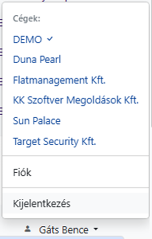 A felhasználó a bejelentkezést követően mindig csak az adott előfizetéshez tartozó társasházakat látja, és az ott beállított jogosultsága szerint tud dolgozni abban a cégben. Amennyiben több előfizetésnél is felhasználói jogosultsága van, a rendszerben váltani tud az előfizetések között. A váltás során mindig csak azok a társasházak jelennek meg számára, amelyek az adott cégben vannak rögzítve.