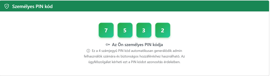 PIN kódja csak az Admin jogosultságú felhasználóknak generálódik, ez szintén a felhasználói fiókban tekinthető meg a Személyes PIN kód részben.