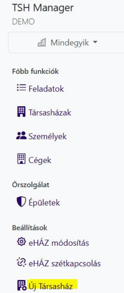 Új társasház felvételére a megfelelő jogosultsággal rendelkező felhasználó számára van lehetőség, az oldalsó menüszalag Új Társasház menüpontra való kattintással.