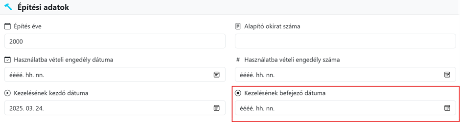A Társasház módosítása nézetben az Építési adatok résznél, a Kezelésének befejező dátuma mező kitöltésével, majd a módosítás elmentésével (Társasház módosítása ikon a lap alján) történik.