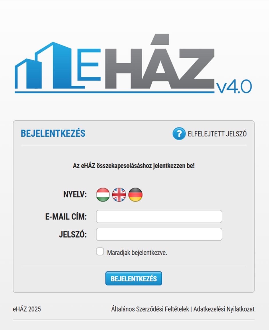 A felületen az eHÁz rendszerbe való belépéshez szükséges bejelentkezési adatokat (e-mail cím és jelszó) szükséges megadni, hogy beazonosításra kerüljenek a kezelt Társasházak.