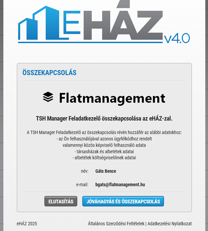 Erre csak admin jogosultsággal rendelkező felhasználónak van lehetősége, az oldalsó menü eHáz kapcsolat gomb megnyomásával.