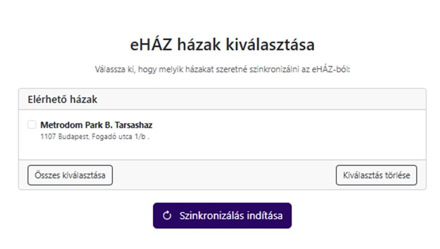Ebben az ablakban megjelenik a felhasználó összes társasháza, melyet az eHáz rendszerben használ. Itt lehet kiválasztani, hogy mely társasházak esetében szeretnénk elvégezni a rendszerek összekapcsolását, a Társasház neve melletti chekbox egyesével való kipipálásával, vagy az összes kiválasztása gomb esetén az összes Társasház kijelölésével.