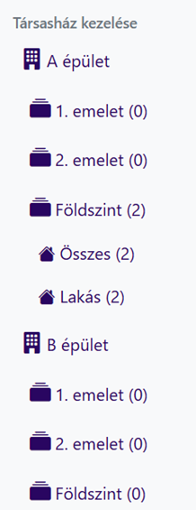 A létrehozott struktúra a bal oldalsó menü Társasházak kezelése résznél látható. (Csak a megfelelő jogosultság esetén látható!)