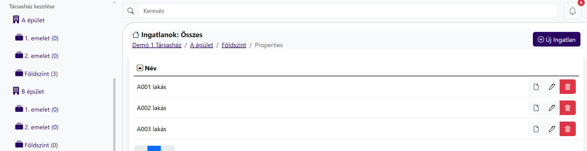 Zárójelben látható, hogy hány elem (emelet vagy albetét) van alá létrehozva. Amelyik elemnél van érték, arra rá tudunk kattintani, és ha tartozik még hozzá alatta lévő szint, akkor ezek itt meg is jellennek. (Példánkban a földszintre kattintva, lenyílik, hogy milyen ingatlantípusok vannak alatta). A lakásra kattintva, pedig jobb oldalon megjelenik a lakások listája.