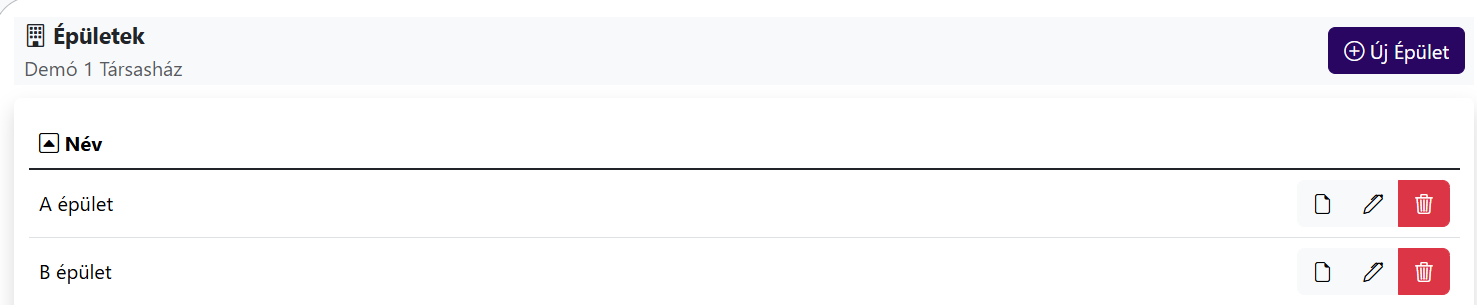 Ekkor feljön a Társasházak listája. Kattintsunk annak a Társasháznak a nevére, melynek a struktúráját meg szeretnénk nézni. Ekkor megjelenik az Épület szint. (Ahány épületet felvittünk alá, egyet vagy többet)
