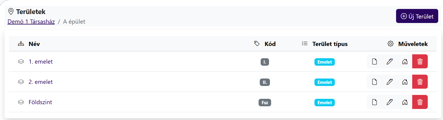 dott kódot, a terület típust, és a különböző műveletekhez tartozó ikonokat.