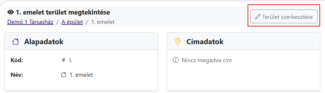 Ha a kiválasztott terület nevére kattintunk, vagy a Műveletek oszlopban a Lap gombra, akkor megtekinthetjük a terület adatait. Annyi adat jelenik meg, amennyit a létrehozásakor kitöltöttünk.