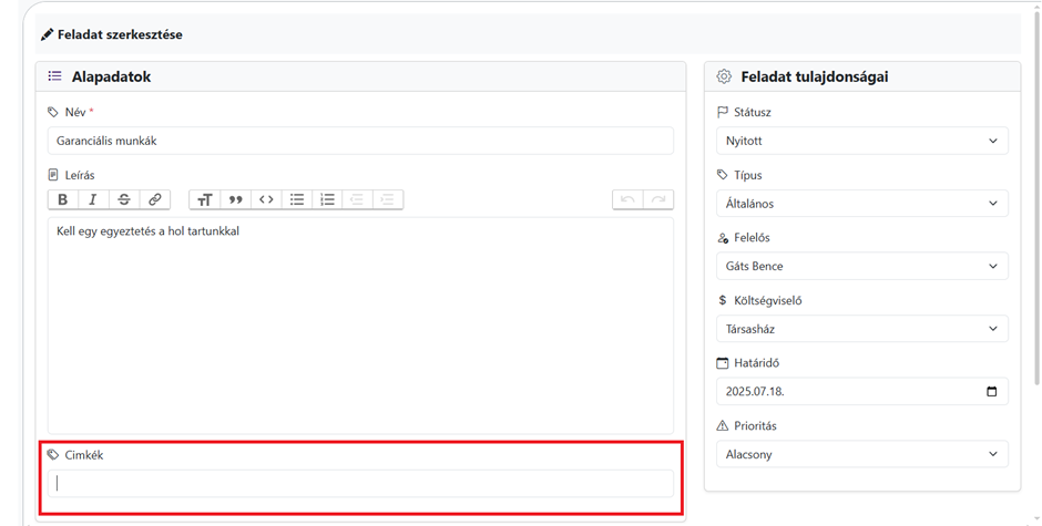 Egy feladathoz lehet címkéket is társítani, így lehet a feladatokat kategorizálni. Ezek segítenek könnyebben eligazodni a feladatok között, illetve a szűrést is elősegítik, ha például szükséges lenne az adott évben elvégzett karbantartási munkákat ellenőrizni, vagy az évben elvégzett lift javításokat áttekinteni, vagy utalást igénylő feladatokat kategorizálni, vagy esetleg rá szeretnénk szűrni az összes napelem beruházást érintő feladatra. (Ekkor érdemes napelem címkével ellátni az összes ilyen feladatot.)