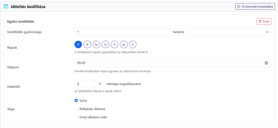 Az Új ütemezés hozzáadása gomb megnyomásával megjelennek az ismétlődés paraméterei.