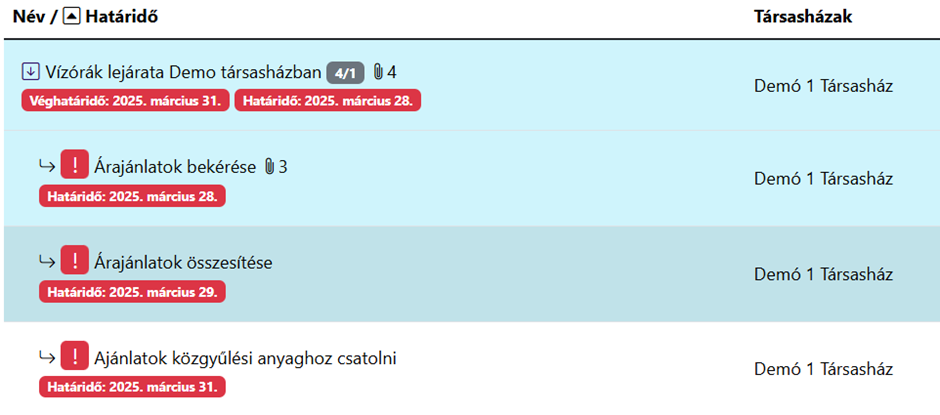 Társasházankénti nézetben minden alfeladat külön sorban látszik, határidő szerint növekvő sorrendben.