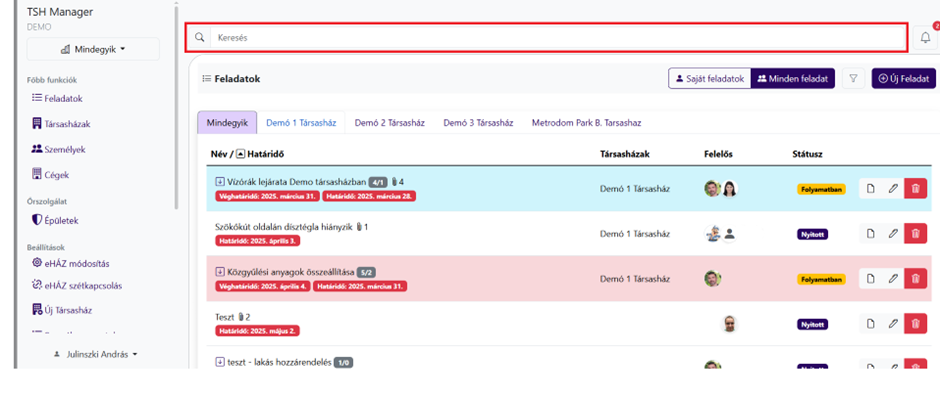 Lehetőség van szabadszavas keresésre a feladatok között bármilyen szöveges tartalomban, a képernyő tetején, a feladatok felett látható keresősávban. Megjelenik benne egy nagyító ikon és a Keresés szó.