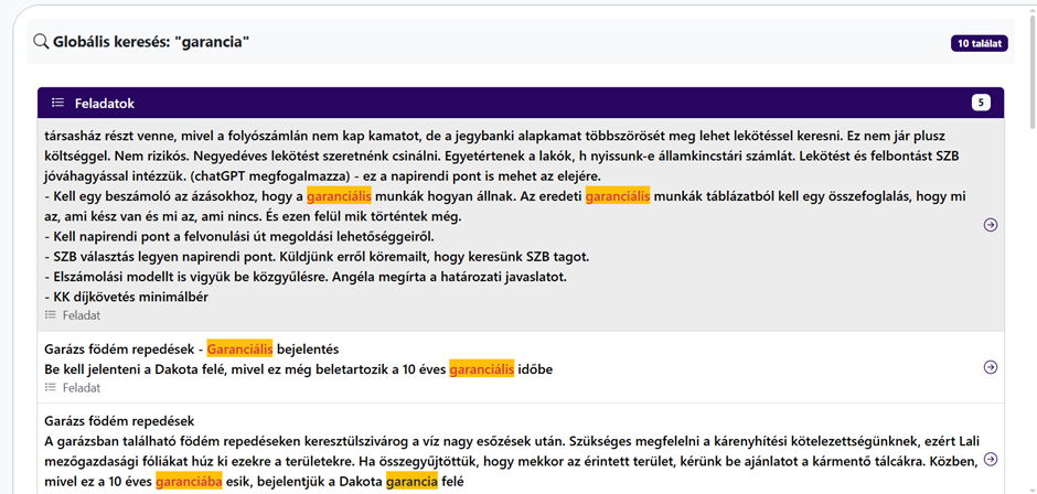 A találatokat listában jeleníti meg a szoftver. Ha rákattintunk valamelyik találatra, akkor elugrik ahhoz a feladathoz.